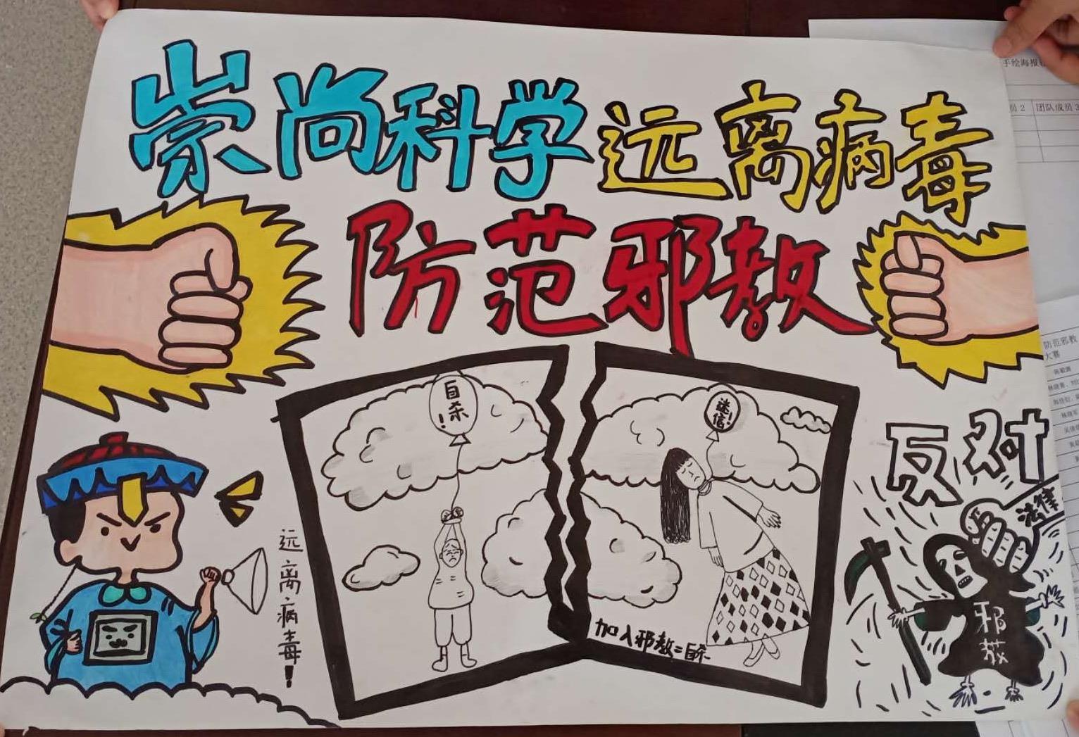在团委引导下学生们踊跃参与以“崇尚科学 远离病毒 防范邪教”主题手绘海报设计赛,展示新冠肺炎疫情防控有关指示精神的学习成效。
